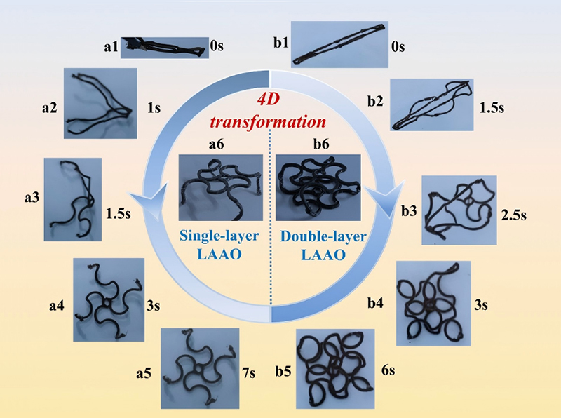 房颤患者发生中风的风险约为普通人群的5倍,而在非瓣膜性房颤患者中,超过90%的心房血栓起源于左心耳(LAA)。左心耳封堵已被证实可有效降低房颤患者约80%的脑卒中风险。为优化封堵器的生物相容性和长期稳定性,我们研发了“4D打印仿生左心耳封堵器”。该产品基于仿生学原理,通过4D打印技术构建网络结构,使其具备与左心耳组织相似的应力-应变行为,实现与周围组织的协同形变,同时具备更高的刚度,为封堵部位提供可靠的结构支撑。这一设计旨在提升器械的贴合性、稳定性和组织整合效果,为房颤患者的卒中预防提供更安全、持久的个性化治疗选择。